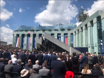 На кадрах видно, що Дональд Трамп виступав біля пам’ятника героям Варшавського повстання. Його в буквальному сенсі «поставили» за скло, а на даху будівлі позаду нього стояли люди зі зброєю.