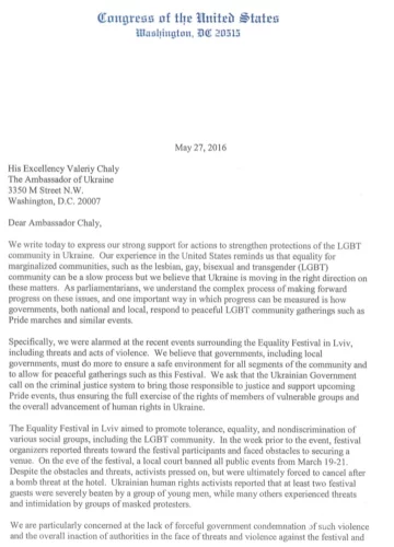 Подчеркивается также, что конгрессмены позитивно отнеслись к принятию Верховной Радой правок в законодательство о сексуальных меньшинствах.