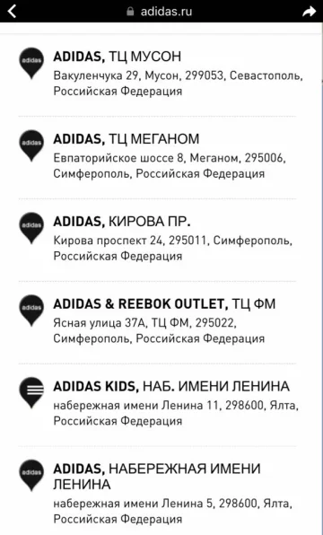 На скрінах можна побачити, що магазини Adidas працюють в окупованих Сімферополі, Севастополі та Ялті. Адресою цих торгових точок вказана “Російська федерація”.